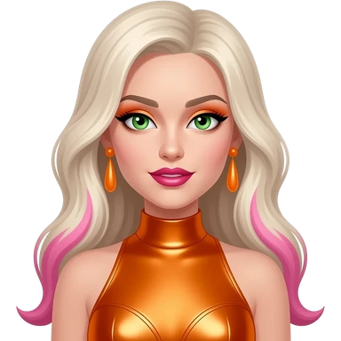 Miranda from Diva Starz with green eyes, long platinum blonde hair with pink highlights, orange eyeshadow, hot pink lipstick, orange metallic high neck dress, orange earrings emoji