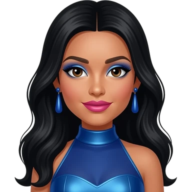 Tia from Diva Starz with dark brown eyes, long black hair, blue eyeshadow, hot pink lipstick, blue metallic high neck dress, blue earrings emoji