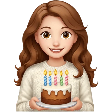 A pretty white girl with hazel brown eyes and brown wavy hair in a cosy white knit sweater, she is celebrating her birthday emoji