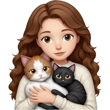 A pretty white girl with hazel brown eyes and brown wavy hair in a cosy white knit sweater, hugging a black and white cat emoji
