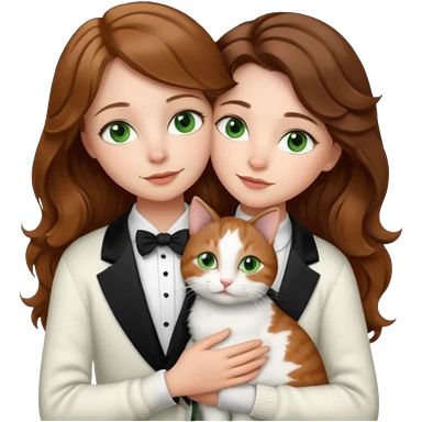 A pretty white girl with hazel brown eyes and brown wavy hair in a cosy white knit sweater, hugging a black and whitebtuxedo cat with green eyes emoji