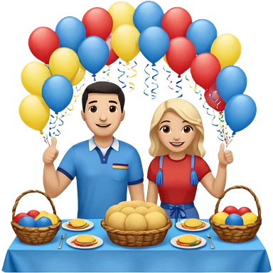 party table decorated with red blue and yellow colors, including a backdrops, balloons arch, streamers and more. On the table are intricate displays of colombian arepas, and baskets of money. In the forefront is a woman and man in simple clothing, big smiles and big thumbs up emoji