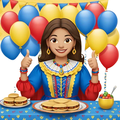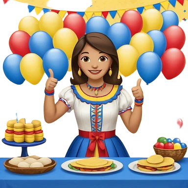 party table decorated with red blue and yellow colors, including backdrops, balloons, streamers and more, on the table are intricate displays of colombian arepas, and in the forefront a woman in traditional colombian dress with a smile and big thumbs up emoji