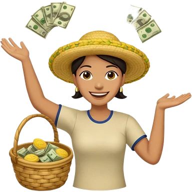 baskets, some overflowing with money, others with colombian arepas in the background a very happy person ridiculously throwing money around emoji