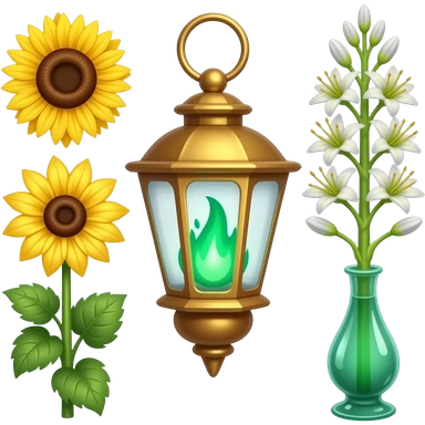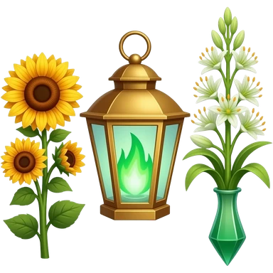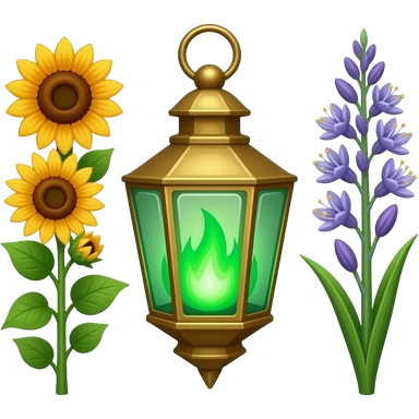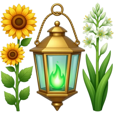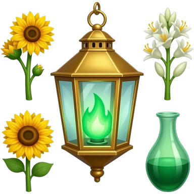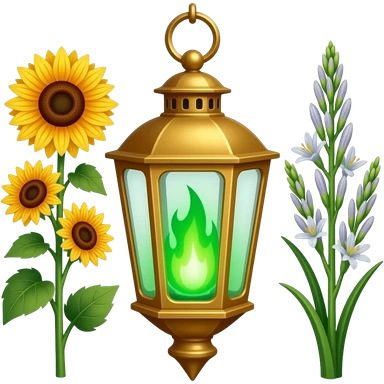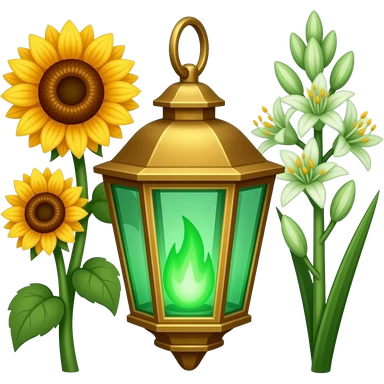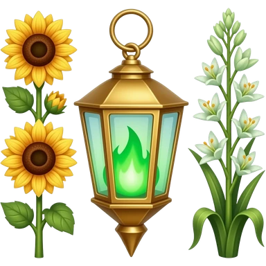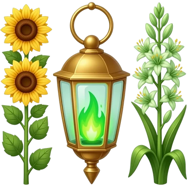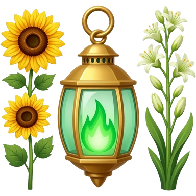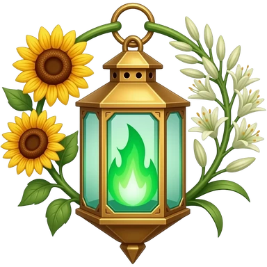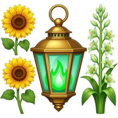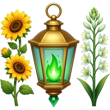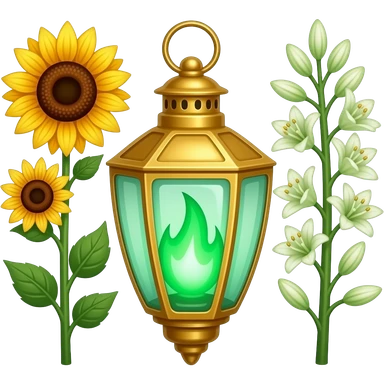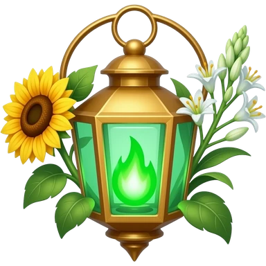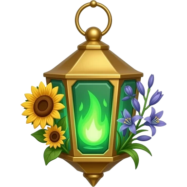 A golden hanging lantern with a bright emerald flames, an empty loop on top, fae themed sunflowers on the left and fully bloomed asphodels on the right as part of the design, but simple focus more on the green flames, paint the glass more green, have its bottom point come to some sort of point emoji