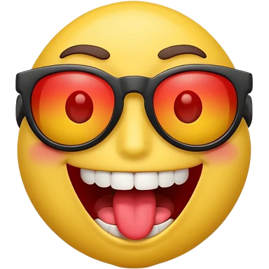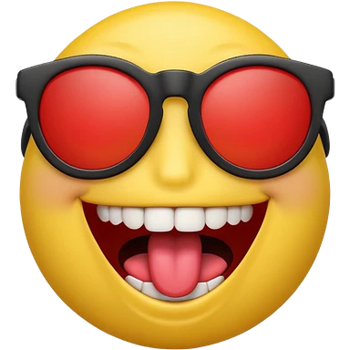 3D emoji character with bright yellow face, wide open smile showing white teeth and red tongue, raised brown eyebrows, and black sunglasses, rendered in a playful and glossy style on transparent background emoji