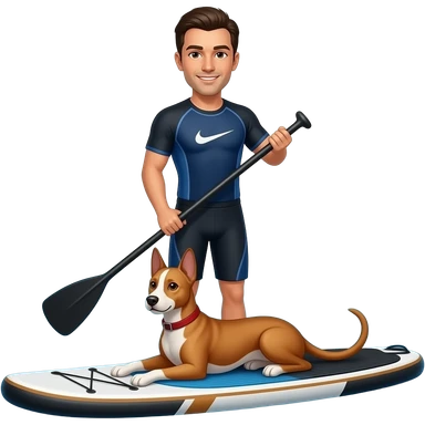 White-coffee coloured Podenco joung adult lying down sphinx like on sup in front front of real paddling paddler on the same sup-board in real peoportions on sea emoji