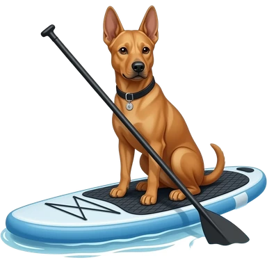 Podenco joung adult sitting sphinx like on sup front paddler on sea emoji