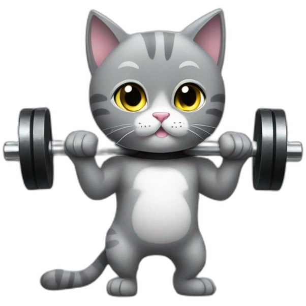 Super cute grey cat working out with black dumbbells bar emoji | AI Emoji Generator