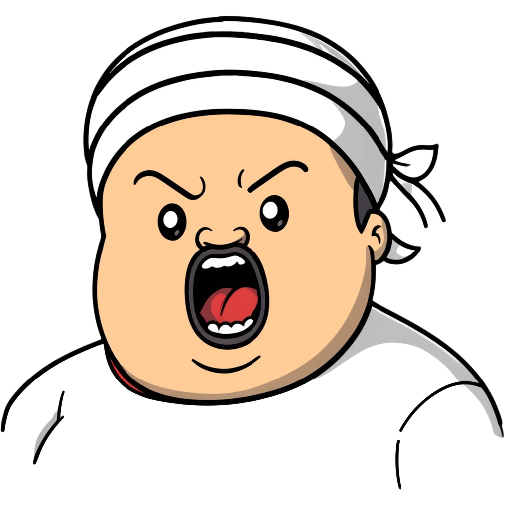 Super extreme tight close-up of just the face of morbidly obese white skin guy with young face, prominent BLACK DURAG tied clearly on head, black beard but no mustache, clean shaven upper lip, black eyes, mouth wide open screaming angrily image | AI Emoji Generator