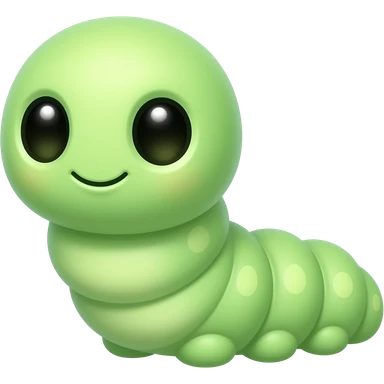 Super cute pastel green inchworm with round puffy body segments, large glossy eyes, tiny smile, soft and chubby look, kawaii style, white background, highly detailed, adorable emoji