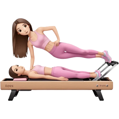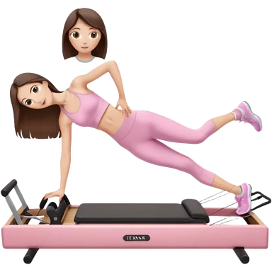 pretty skinny white brunette teen long hair with hazel eyes and a small waist in light pink workout clothes in a plank on a pilates reformer emoji