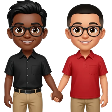 Black Boy with black hair, glasses, black shirt, beige pants, Hispanic Boy with black buzz cut hair, glasses, red shirt, beige pants holding hands emoji