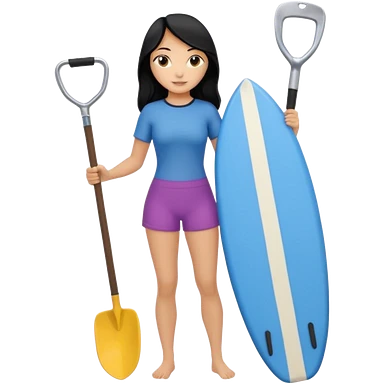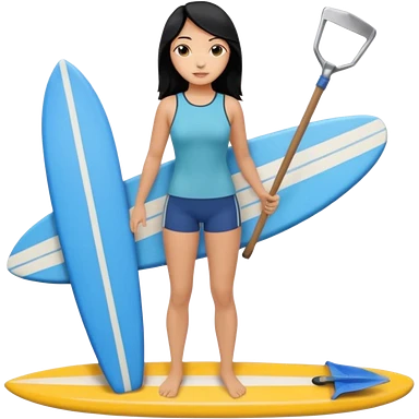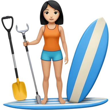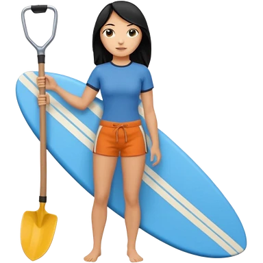 Surfer(woman) black hair holding her cell phone and long garden shovel with another hand. Under her feet, there is one blue surfing board. emoji