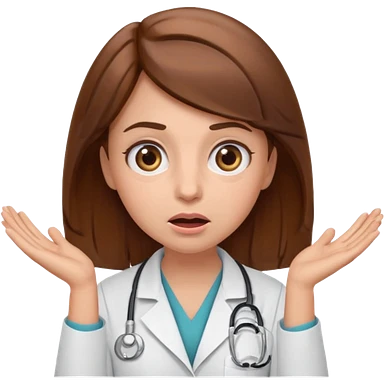 Surprised female doctor emoji with brown hair, both hands on her cheeks, big expressive eyes, clean emoji style emoji