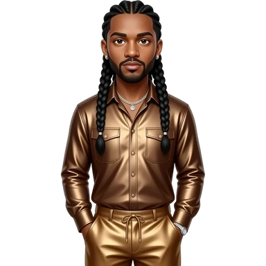 Omarion with long black braided hair, bronze metallic shirt, bronze metallic baggy pants, silver necklace and earrings emoji