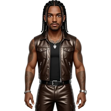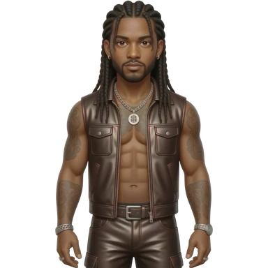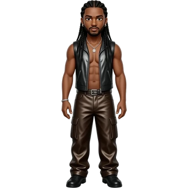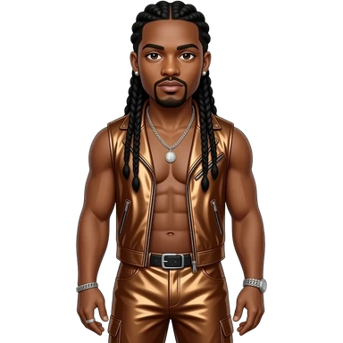 Omarion with long black braided hair, dark brown metallic vest, dark brown metallic baggy pants, shirtless with silver necklace and earrings emoji