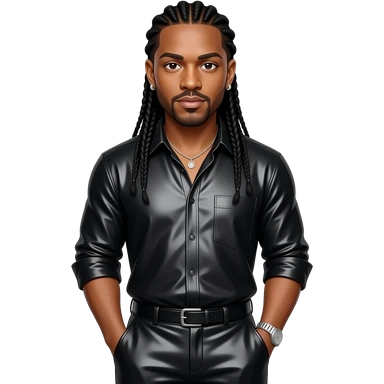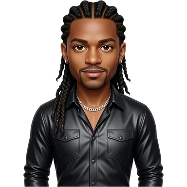 Jermaine Dupri with black braided hair, black metallic shirt, black metallic baggy pants, silver necklace and earrings emoji