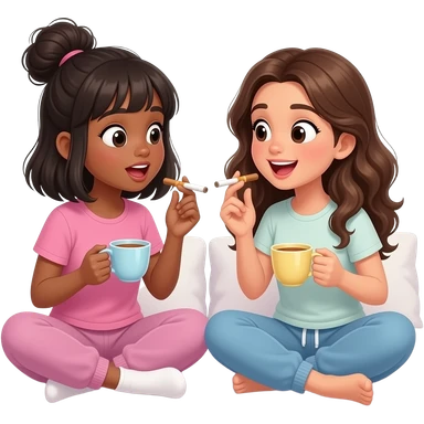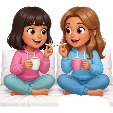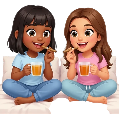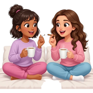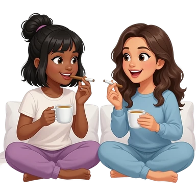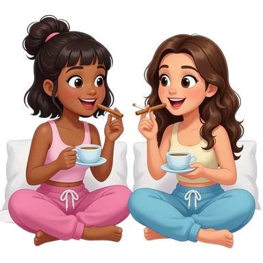 A black girl with bangs and shoulder length hair and a Hispanic girl with long light brown hair gossiping while smoking blunts and drinking tea out of tea cups and wearing sweats laying on a bed. We both have surprised smiling look on our face emoji