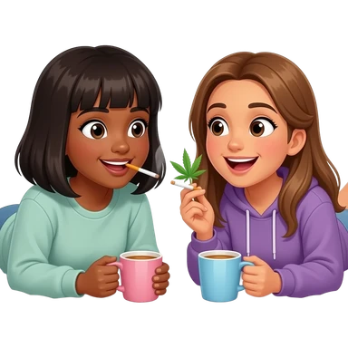 A black girl with bangs and shoulder length hair and a Hispanic girl with long light brown hair gossiping while smoking weed and drinking tea out of tea cups and wearing sweats laying on a bed. We both have surprised smiling look on our face emoji