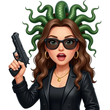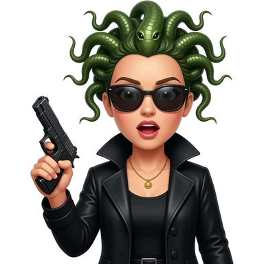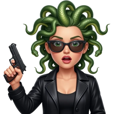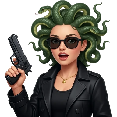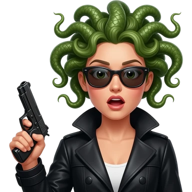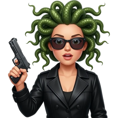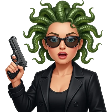 Surprised beautiful female Medusa in black coat with sunglasses holding gun emoji