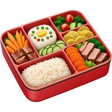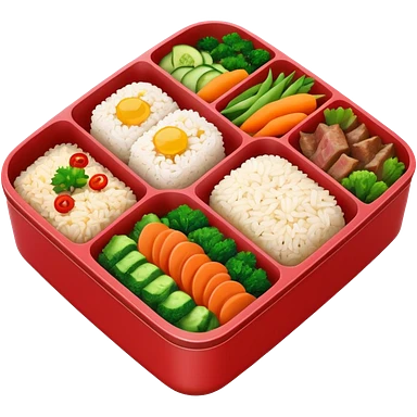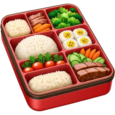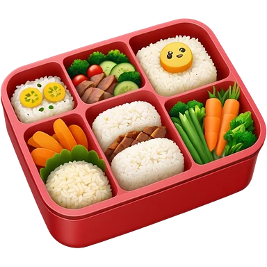 cheerful bento box with sushi, onigiri, and tempura, captioned, “Oishii Time!” emoji