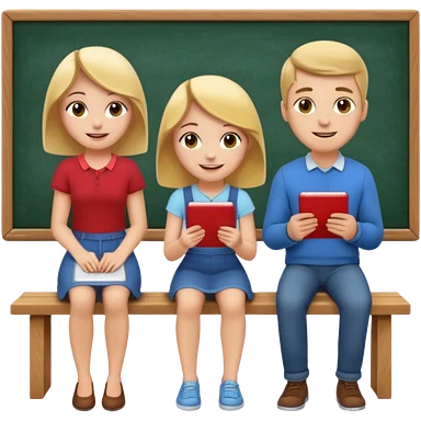 Girl is teaching a guy how to make emojis. Girl at blackboard, guy on bench learning. emoji