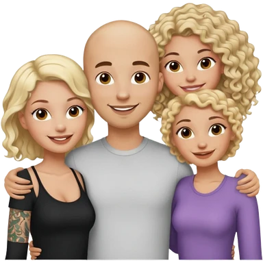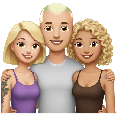 throuple tatted bald boyfriend with two girlfriends, one long blonde hair, other short curly brunette emoji
