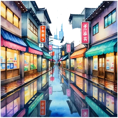 A loose, flowing watercolor painting of a Tokyo street in the rain, showing colorful reflections in puddles and glowing shop signs. emoji