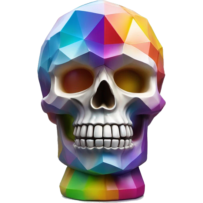 symbolic skull sculpture symbolizing chromatic light with a geometric, faceted design. The bottle is standing upright with angular and baroque features. The vibrant rainbow of colors highlights the sharp edges and planes. emoji | AI Emoji Generator