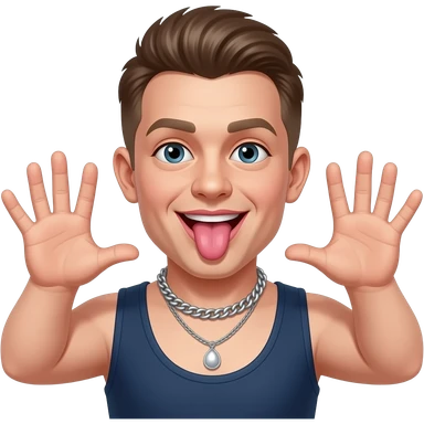 Down Syndrome drag queen, holding up their open extended hands up to each side of their face, poking their tongue out emoji