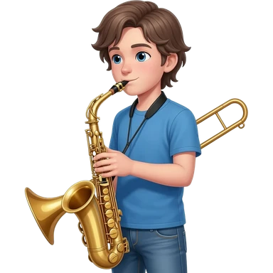 tall white boy with a medium length middle part, playing alto saxophone with a trombone behind him. he boy is wearing jeans and a blue t shirt. emoji