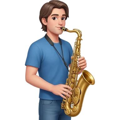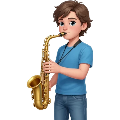 tall white boy with a medium length middle part, playing alto saxophone. the boy is wearing jeans and a blue t shirt. emoji