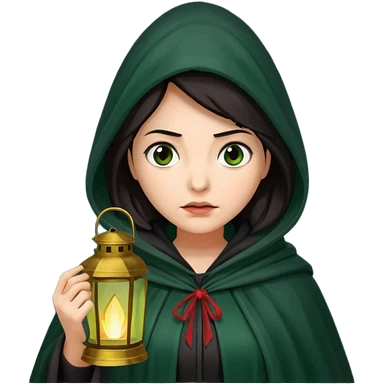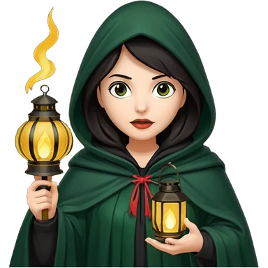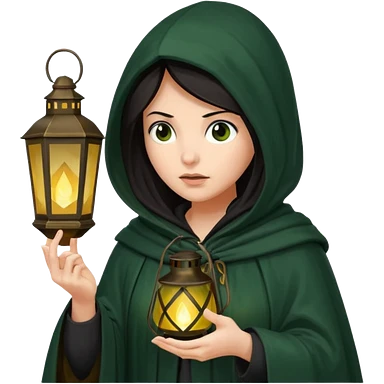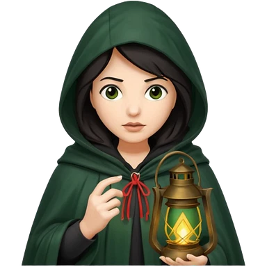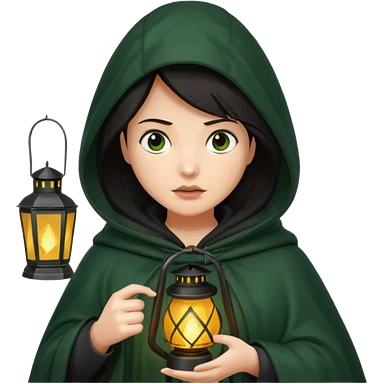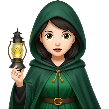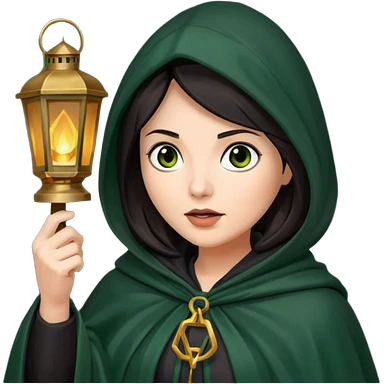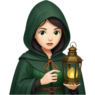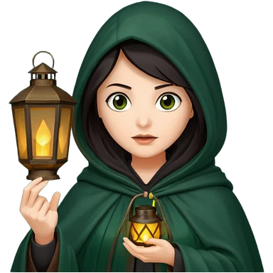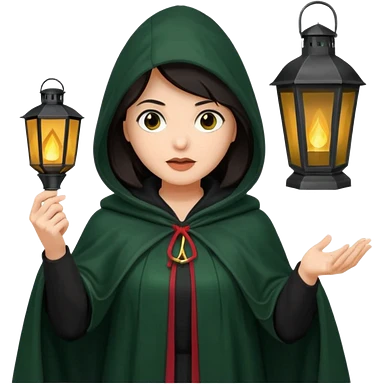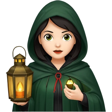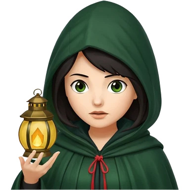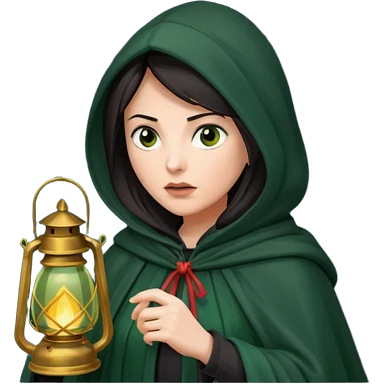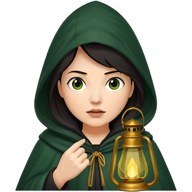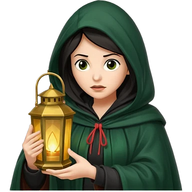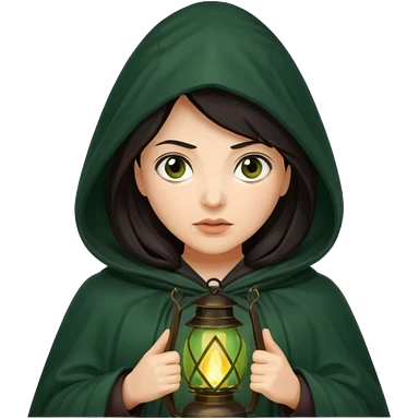traitor tv show, dark haired woman wearing dark green cloak with hood up who looks very evil, is holding up a lantern, and looking down emoji