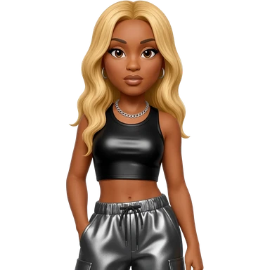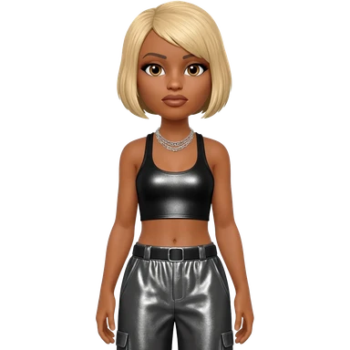 T- Boz from TLC with brown eyes, blonde hair, black metallic crop top, charcoal metallic baggy pants, silver necklace emoji