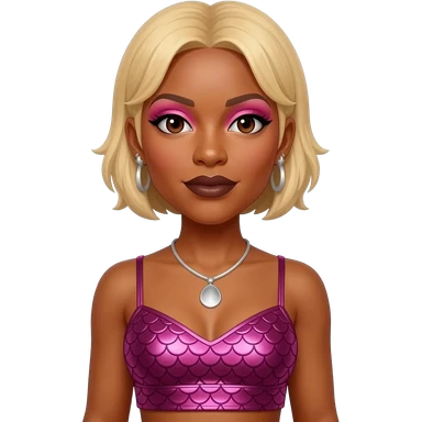 Tionne T-Boz Watkins from TLC with dark brown eyes, short blonde hair, pink eyeshadow, dark brown lipstick, dark pink metallic mermaid crop top, silver necklace and earrings emoji