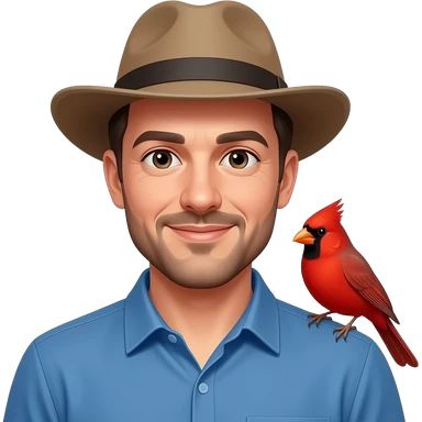 a man waring a hat and wear blue shirt and hold a red bird on right t shoulder emoji