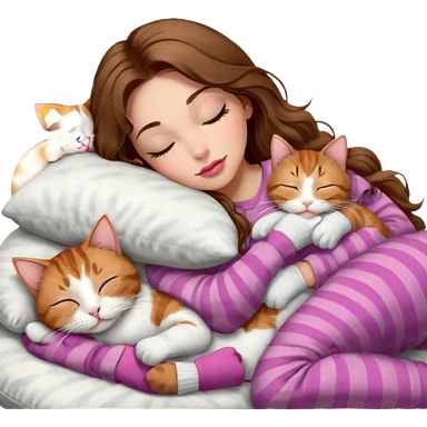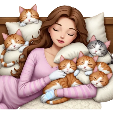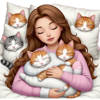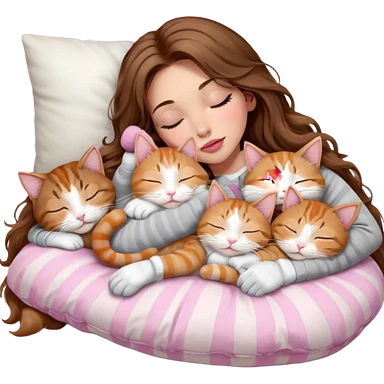 girl with long wavy brown hair, brown eyes, long lashes makeup, sexy pink lips, light to medium complexion, sleeping on a cozy pillow, with 6 cats: 1 brown and white tabby cat, 1 ginger and white, 2 grey and white, 1 grey with white mittens and small white patch on chest and 1 calico, sleeping emoji