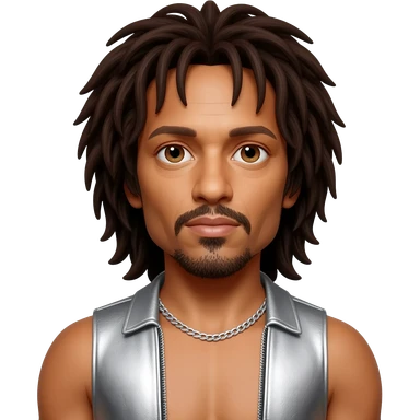 Lenny Kravitz with brown eyes, long dark brown hair, silver metallic vest, shirtless with silver necklace emoji