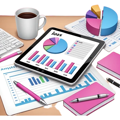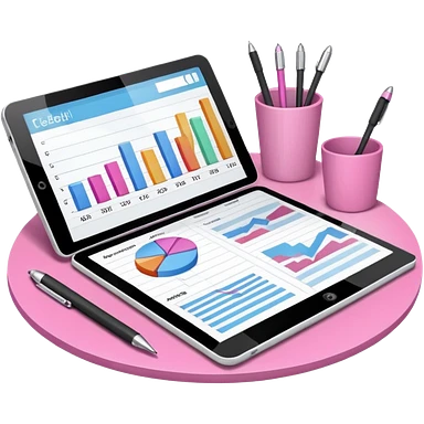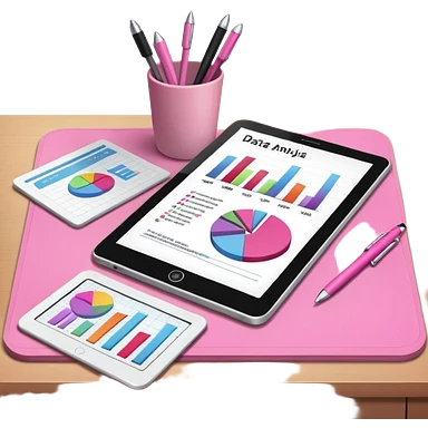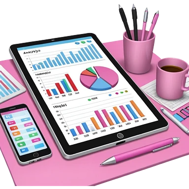 tablet on a desk with papers and pens showing data analysis stuff on it pink emoji