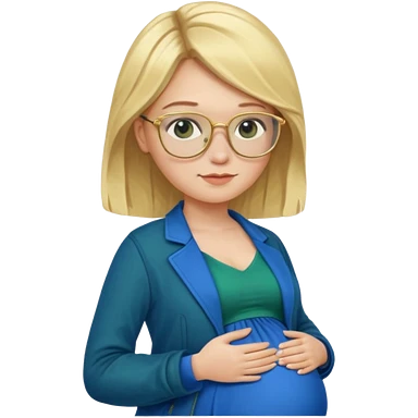 pregnant blonde 18-year old with golden glasses in a bright blue dress and a dark green jacket on top of the blue dress emoji