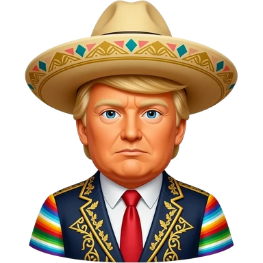 A very Orangish, media stereotypical Donald Trump in the Apple IOS simple style, wearing Stereotypical and ornate Mexican clothing And hat. Simplified face and very top bust. Colorful clothing, the literal EMBODIMENT of the phrase “Taco Trump” emoji