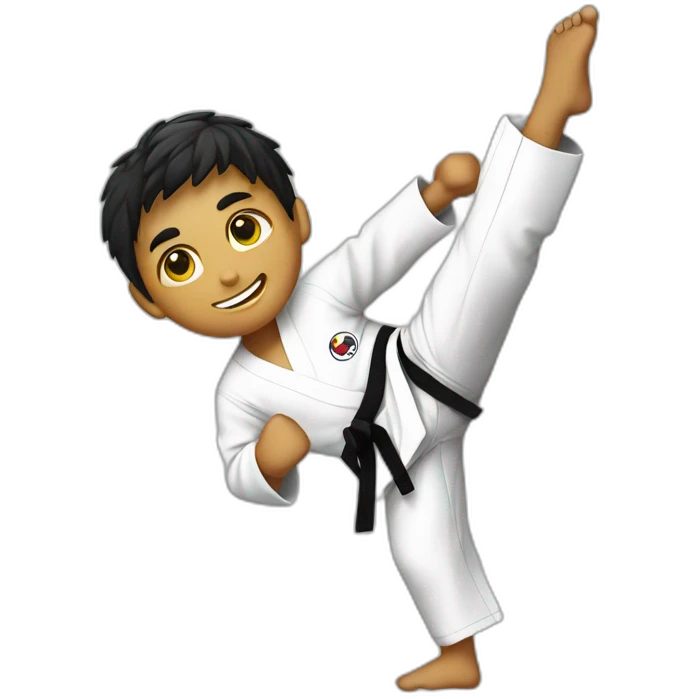 A man doing taekwondo, kicking, and on his foot there is a plate emoji