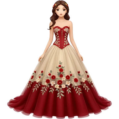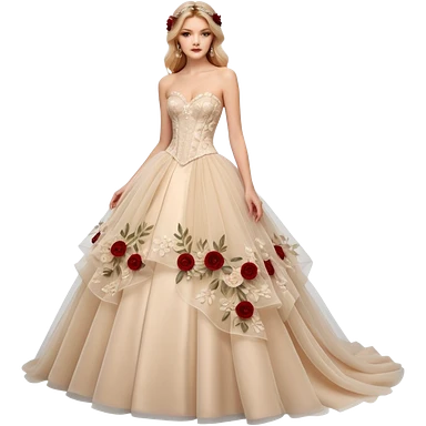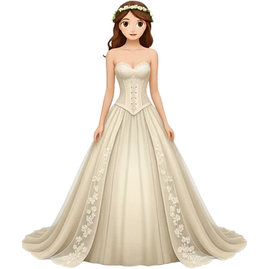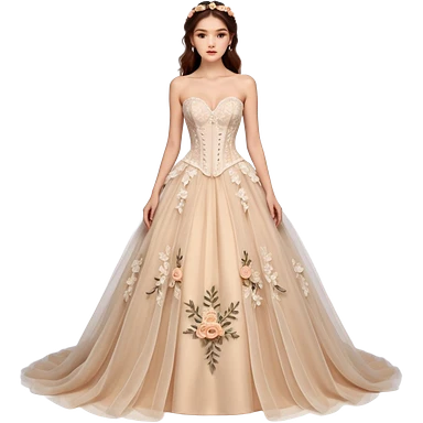 A luxurious strapless A-line wedding gown featuring a sheer lace corset bodice with structured boning, intricate floral embroidery, and a flowing layered tulle skirt adorned with delicate 3D floral appliqués for a soft, romantic, fairytale look. emoji