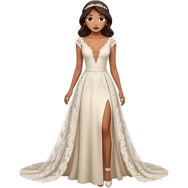 A modern lace wedding gown with a deep plunging neckline, cap sleeves, and a flowing skirt featuring two high front slits for a bold and romantic look. emoji