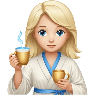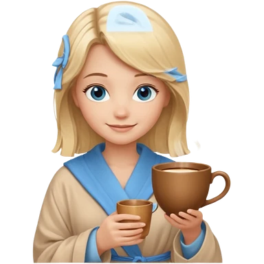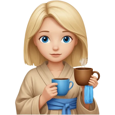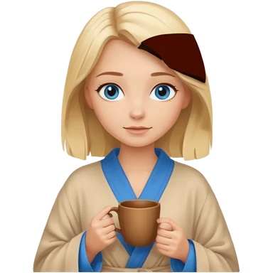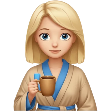 cozy blonde girl with middle length hair and blue eyes holds a brown cup in beige robe emoji