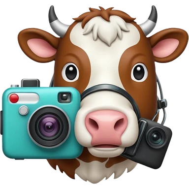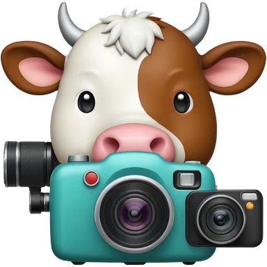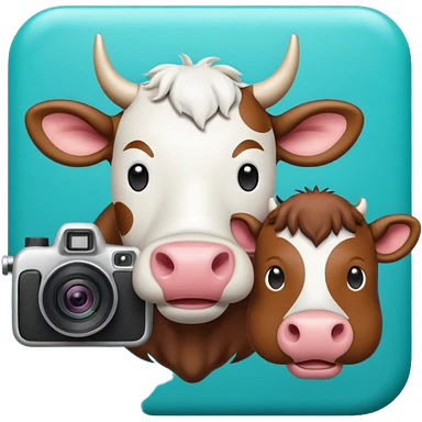 Emoji-style icon showing a cow and buffalo with a camera and image-upload symbol, representing taking a photo or selecting a file for breed detection. Simple, friendly, rounded design, clear at small sizes, teal and white accents, no text, transparent background. emoji