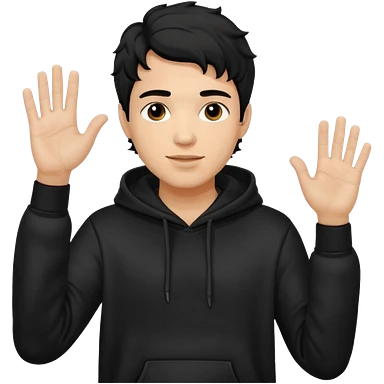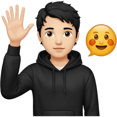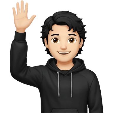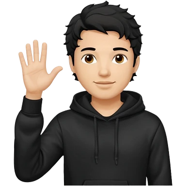 Now create man waveing with one hand with little bit wavey dark black hair with black hoodie on and make him light skin. his haircut is mid fade with hair on his forehead emoji