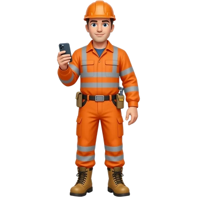 tall engineer in full Hi-vis orange clothing and boots holding a mobile phone emoji