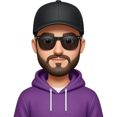 tall skinny guy with black basecap with white twitch logo, anchor-beard, purple hoodie, sunglasses emoji | AI Emoji Generator